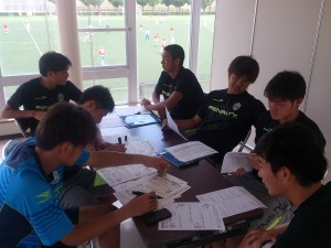 事前に子どもたちに書いてもらった「夢アンケート」に目を通し、どんな風に授業を進めていこうかと、それぞれペアを組む選手同士で話し合いをしました。