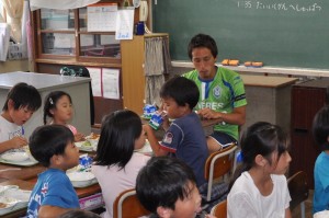 武田選手、大竹選手、坪井選手、アンドレバイア選手が訪問し、子どもたちと一緒に楽しく給食を食べました。