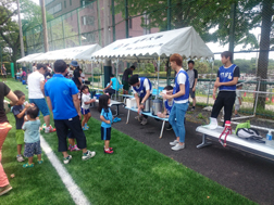 このスポーツ教室は産業能率大学の学生達が授業として運営サポートをしております。参加人数も増え、暑い日の屋外での教室でしたので、テントの準備も前回より多く設置しましたが、前回の経験を活かし、短時間で設営も撤去も行えました。熱中症対策で給水用のドリンクも準備して休憩時間に参加者に提供してくれました。