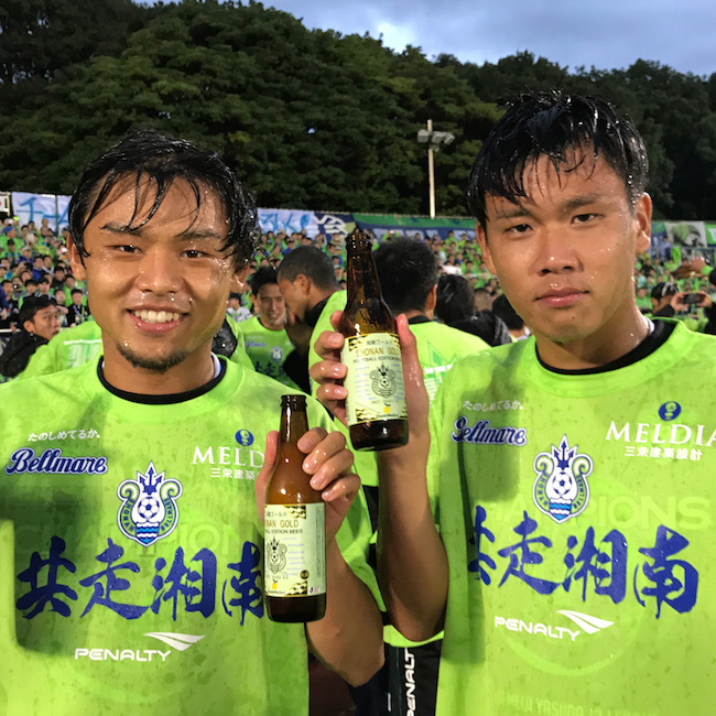 岡山戦後のビールかけでも使用!ホームゲームでもおなじみの「ベルマーレビール」。