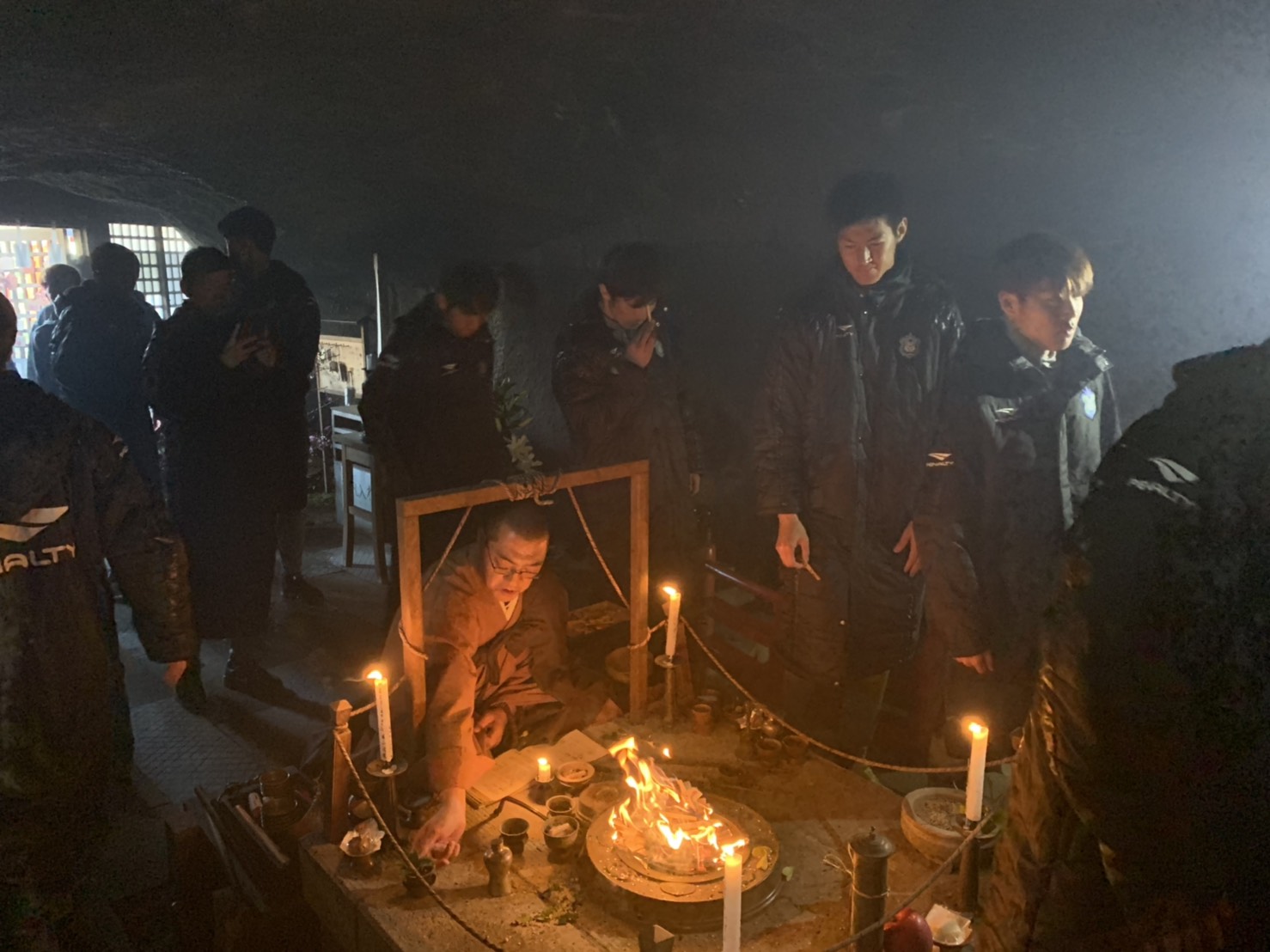 その後、お寺の境内にある弁才天 岩屋霊穴の中に入ります。住職が岩屋霊穴の火が焚かれた中でずっと祈祷をしてくださっているところへ入り、一人ひとり、木をくべて祈りました。(これには、「火で自分の中の迷いを清める」という意味があるそうです)