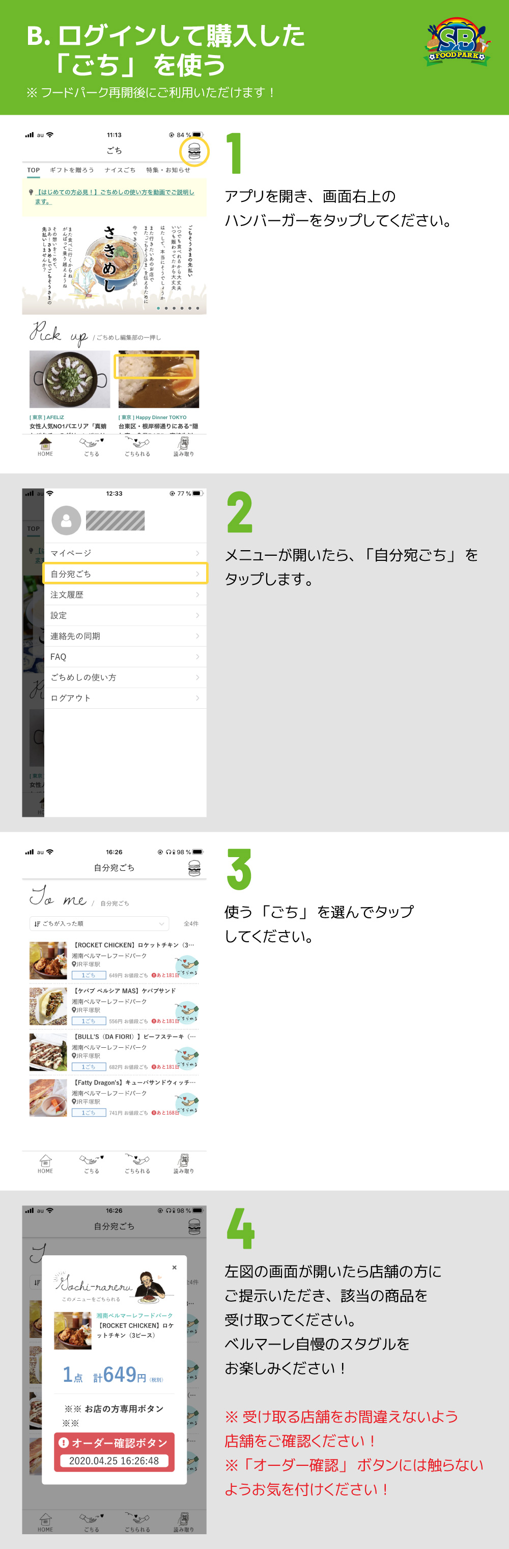 ・その他のメニューをご購入された方:「ごち」の有効期限6か月以内でのフードパークの再開が難しいと判断された場合、入れて頂いた「ごち」相当の食券を送付