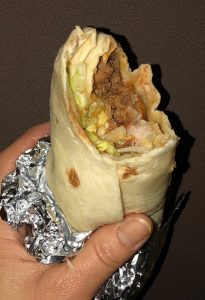 具材、野菜、チーズ、サルサ、ライムライス(一部白米)をフラワートルティーヤ生地で包み巻きし、アルミホイルでくるんだ受け取ってびっくりのボリューム。