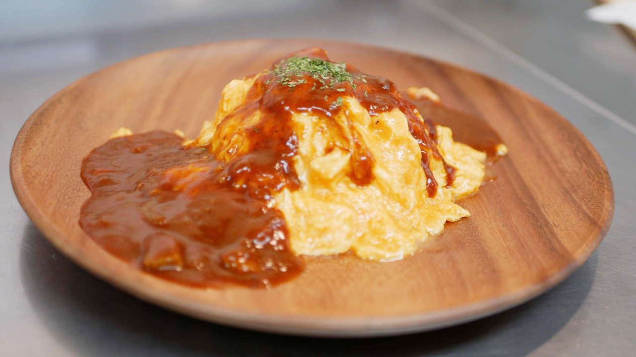 ハンバーグをトッピングした、自家製デミグラスソースのオムライス