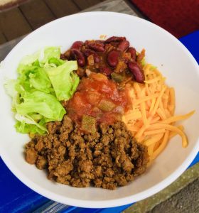 ライスに牛100%の粗め挽肉、チリビーンズ、サルサ、チーズ、野菜をのせた見た目も楽しいボウル!店舗販売はしていない、キッチンカー限定メニューです。