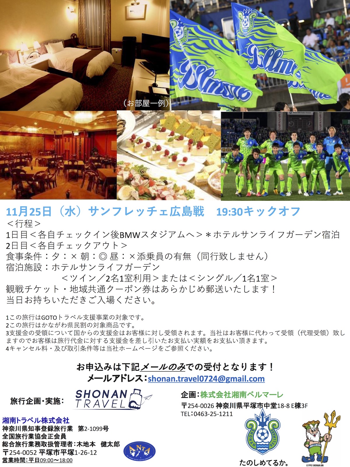【GoToトラベル・かながわ県民割適用プラン】11月25日(水)サンフレッチェ広島戦 地域応援・魅力再発見ホームゲーム観戦宿泊プランのお知らせ