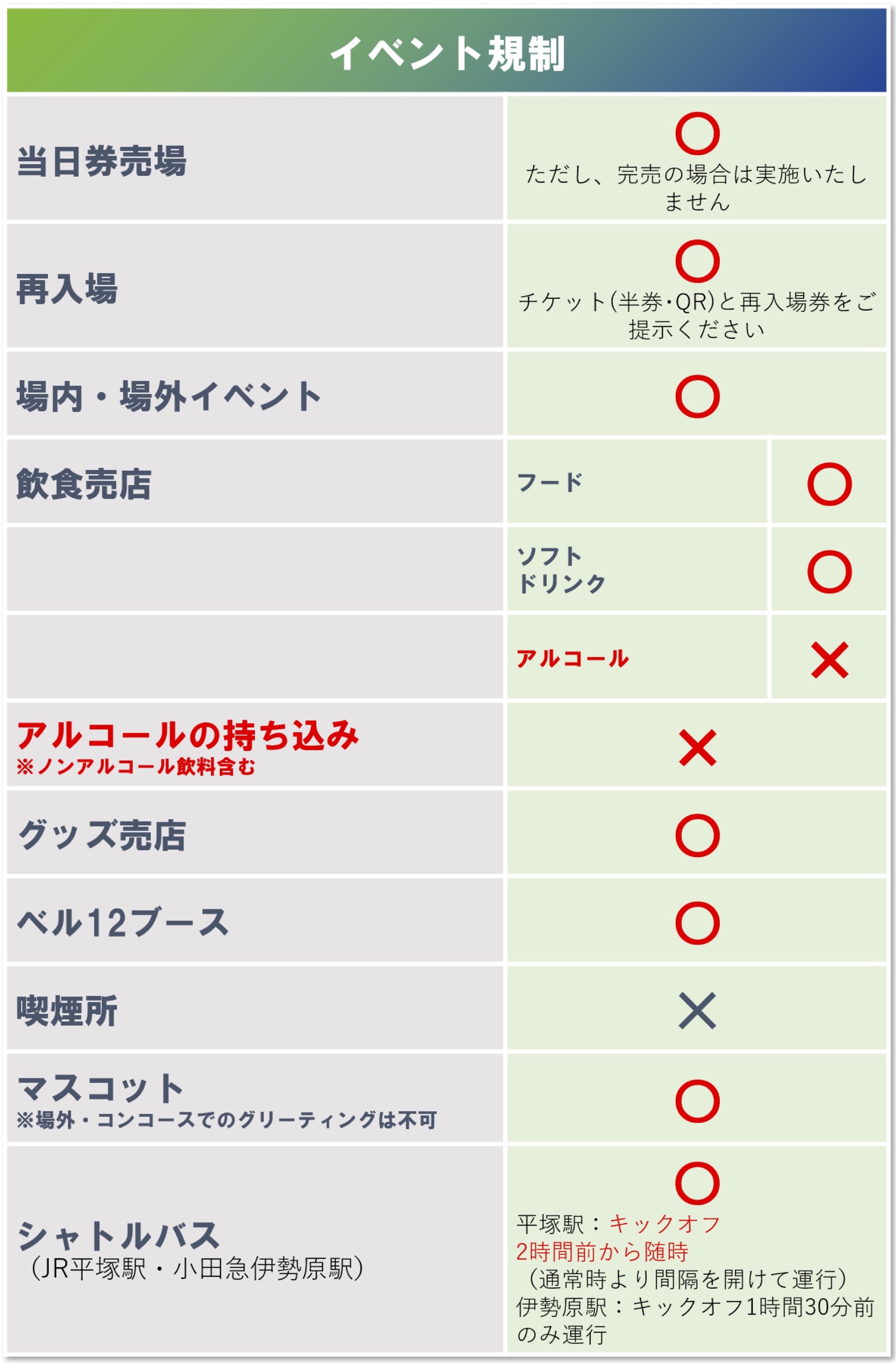 湘南ベルマーレでは、ガイドラインの運営プロトコルに沿って新型コロナウイルスに対する社会全体の警戒度合いを緩和していくため、下記の運用方法でホームゲーム開催をしてまいります。安全・安心な試合開催のために皆様のご理解とご協力を何卒よろしくお願いいたします。