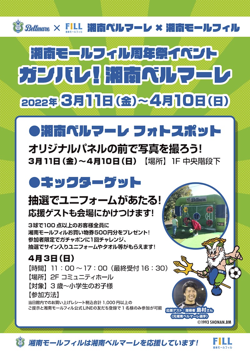 この度、オフィシャルクラブパートナーとしてご支援いただいております「湘南モールフィル」様にて、3月11日(金)~4月10日(日)に湘南モールフィル周年祭イベント「ガンバレ!湘南ベルマーレ」を実施いただくことになりましたのでお知らせいたします。