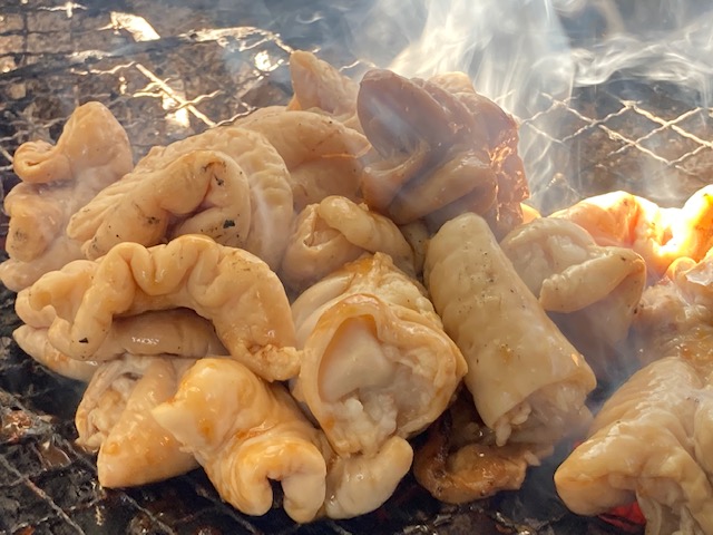 「炭火焼きとろホルモン焼」 当日価格:600円 厚木B級グルメのホルモンを3時間じっくりと煮込み高温の炭火で一気の焼き上げました。 |