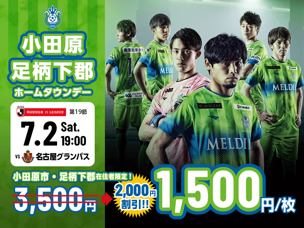 7月2日(土)名古屋グランパス戦は“小田原・足柄下郡ホームタウンデー”として開催いたします。一人でも多くの皆さまに我が街のクラブとしてより親しみを持っていただけるよう小田原市・足柄下郡(箱根町・真鶴町・湯河原町)在住者様限定で「小田原・足柄下郡ホームタウンデーチケット」を販売いたします。