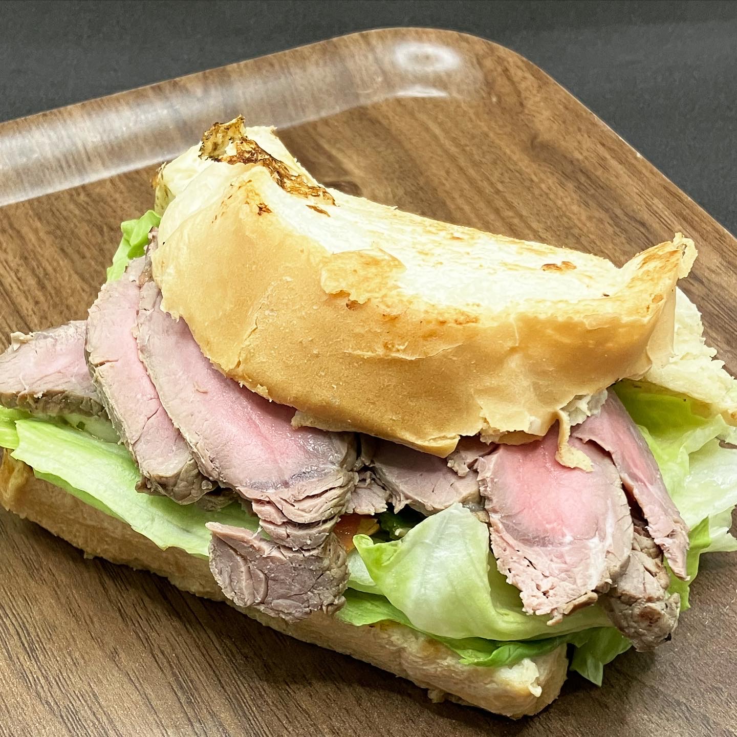 『【肉祭り】ローストビーフサンド』 当日販売価格:800円 二刀流の真骨頂!日頃はブラジル料理店を営む店主がつくる魂の自家製ローストビーフをサンドしました!! |