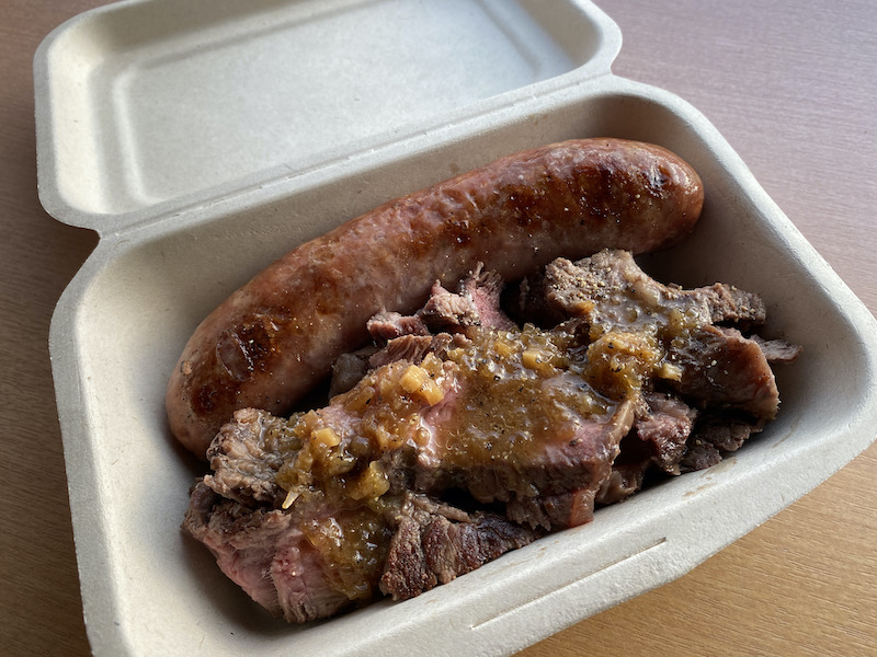 『シュラスコ丼』 当日販売価格(税込):1200円 ガーリックライスの上に炭火で焼いた牛肉、リングイッサソーセージ、味付けチキンをのせた丼ぶりです。玉ねぎ、トマト、きゅうり、パセリを刻んでお酢などで味付けしたらヴィナグレッチソースもつきます! |