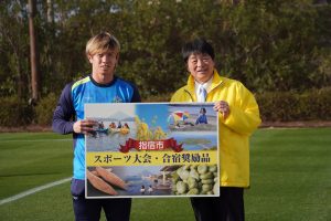 チームを代表して山田直輝選手が「温かい歓迎をしていただき、本当にありがとうございます。今年も最高のピッチと最高のお風呂と今日いただいた食事をいただいて、最高の合宿にしたいと思っています。一年を通して指宿市の皆さまにいい報告ができるように頑張っていきますので、この合宿が終わるまでどうぞよろしくお願いいたします」とお礼の挨拶をしました。