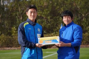トレーニングの前にはグラウンドで歓迎セレモニーを実施していただきました。指宿市の打越明司市長にもお越しいただき、キャンプの成功とシーズンの躍進に繋がりますように、とお話いただきました。