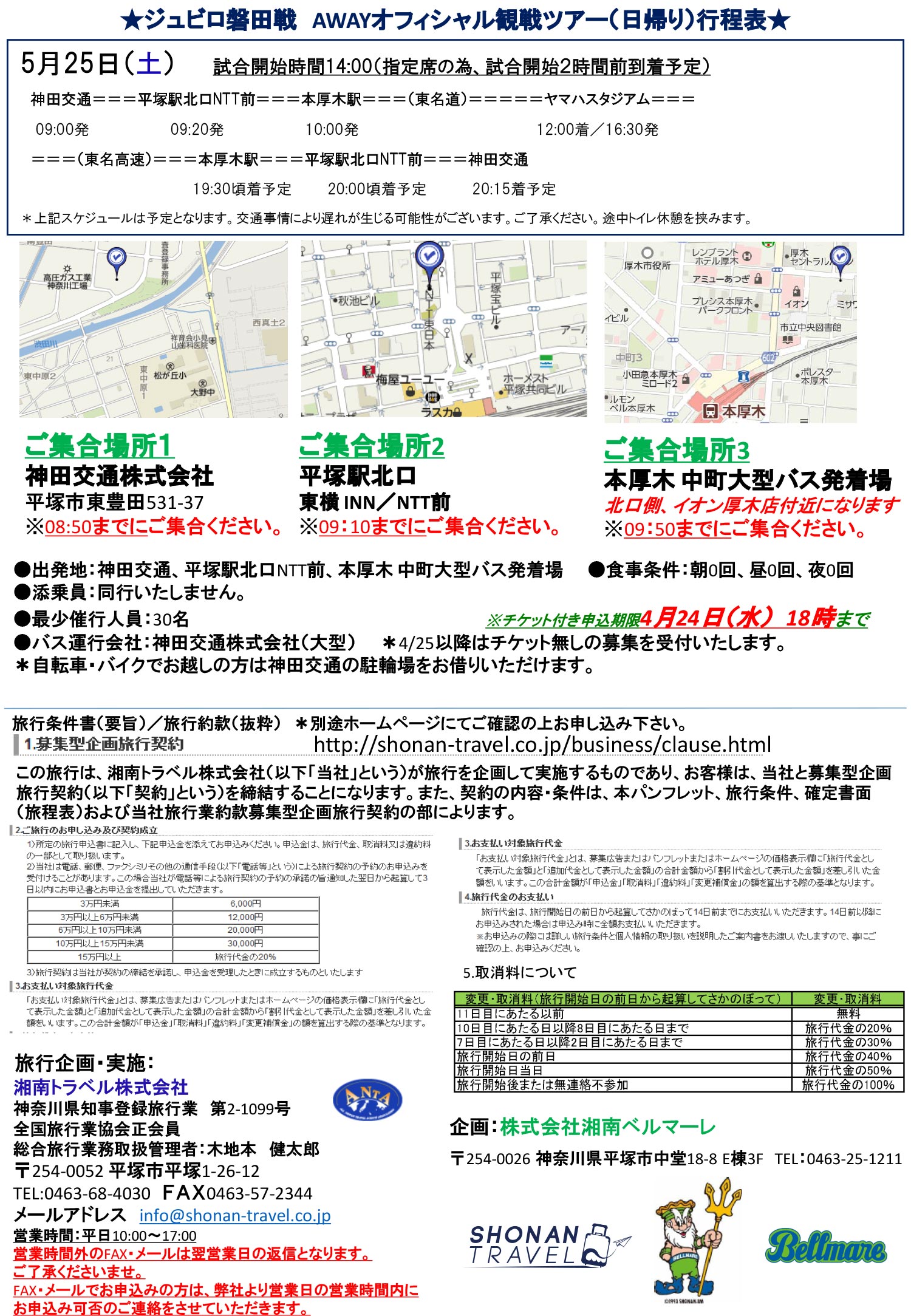 5月25日(土)アウェイジュビロ磐田戦(14:00キックオフ/@ヤマハ)のビジター席チケット付き、神田交通車庫・平塚駅北口NTT前・本厚木中町大型バス発着場からご乗車いただけるバスツアーを開催いたします!