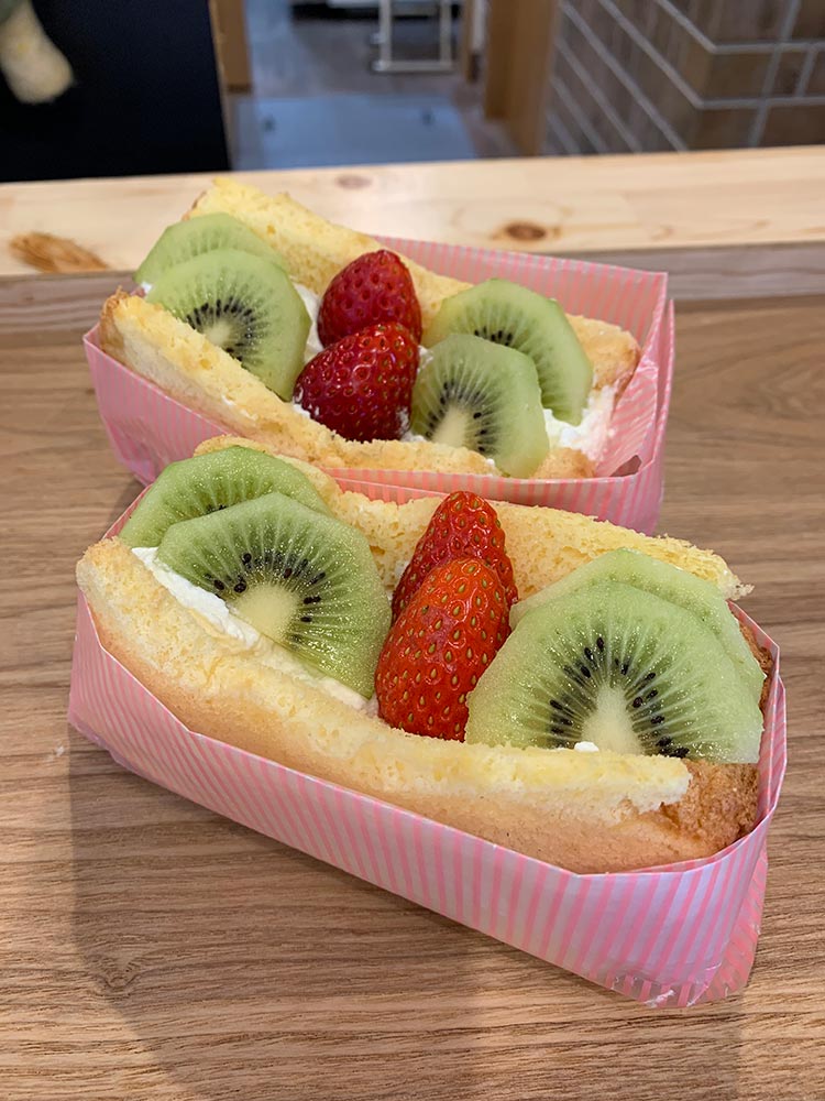 『シフォンサンド』 当日販売価格(税込):650円 しっとりふわふわのシフォンケーキに苺とキウイ、北海道生クリームをサンドしました |