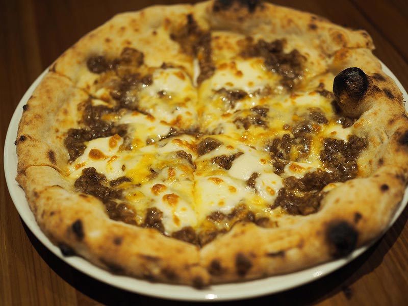 『藤沢産藤稔100%ワインで煮込んだキーマカレーpizza』 当日販売価格(税込):1250円 水を一切使わず、湘南藤沢産藤稔葡萄100%果汁で仕上げたフルーティーなキーマカレーのPizza |