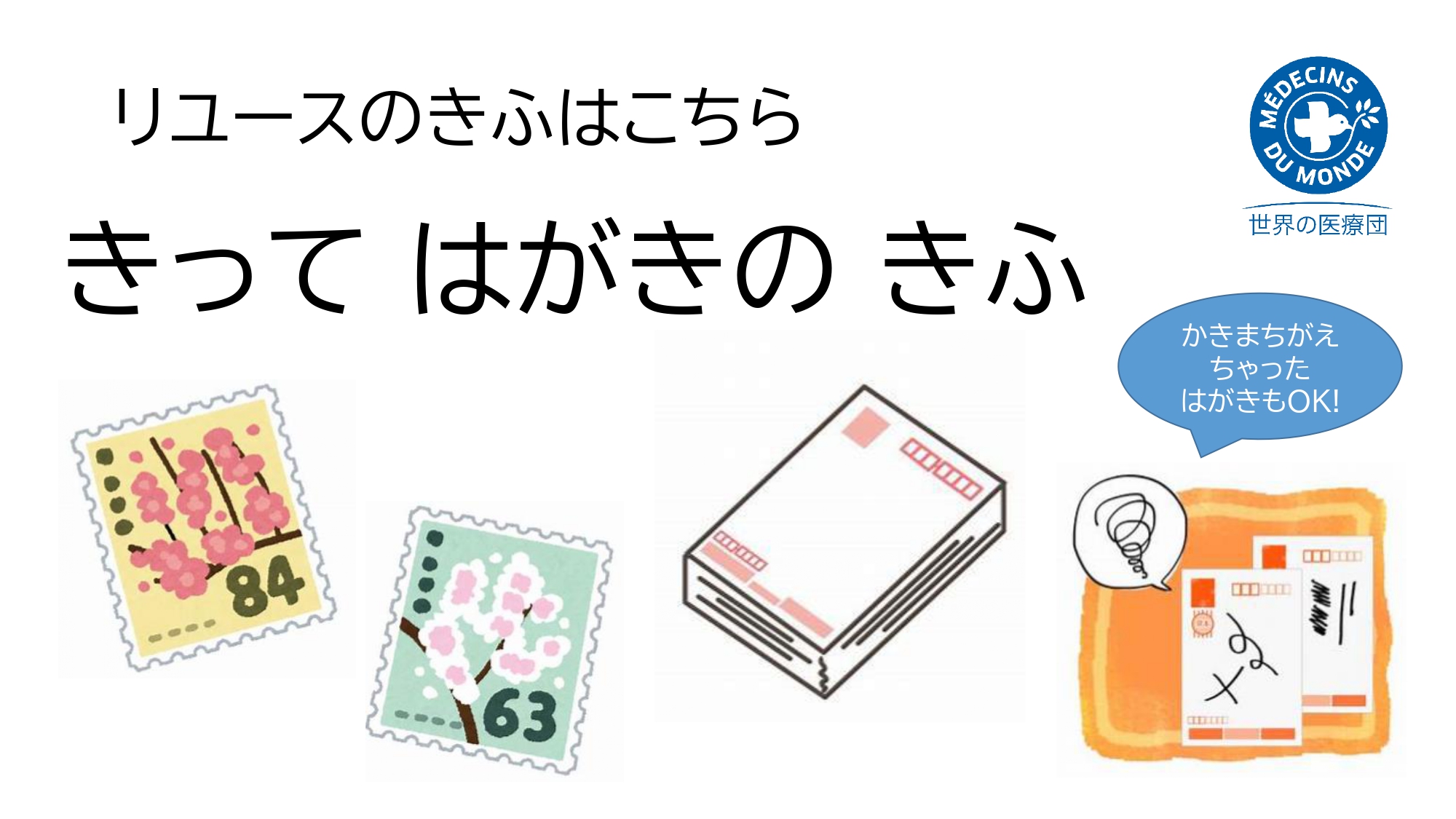 世界の医療団の医療支援をサポートするために「書き損じハガキ」「未使用切手」「読み終えた本やCD・DVD・ゲームソフト」の回収を通じた寄付活動をおこないます。