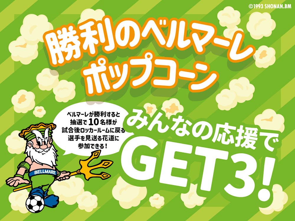 『ポップコーン(塩・ダブル)』 当日販売価格(税込) 650円 豆からこだわったポップコーン!ベルマーレが勝利すると抽選で10名様が当たる「ロッカールームに戻る選手を花道で見送る権利」応募券2枚がついてきます。 |
