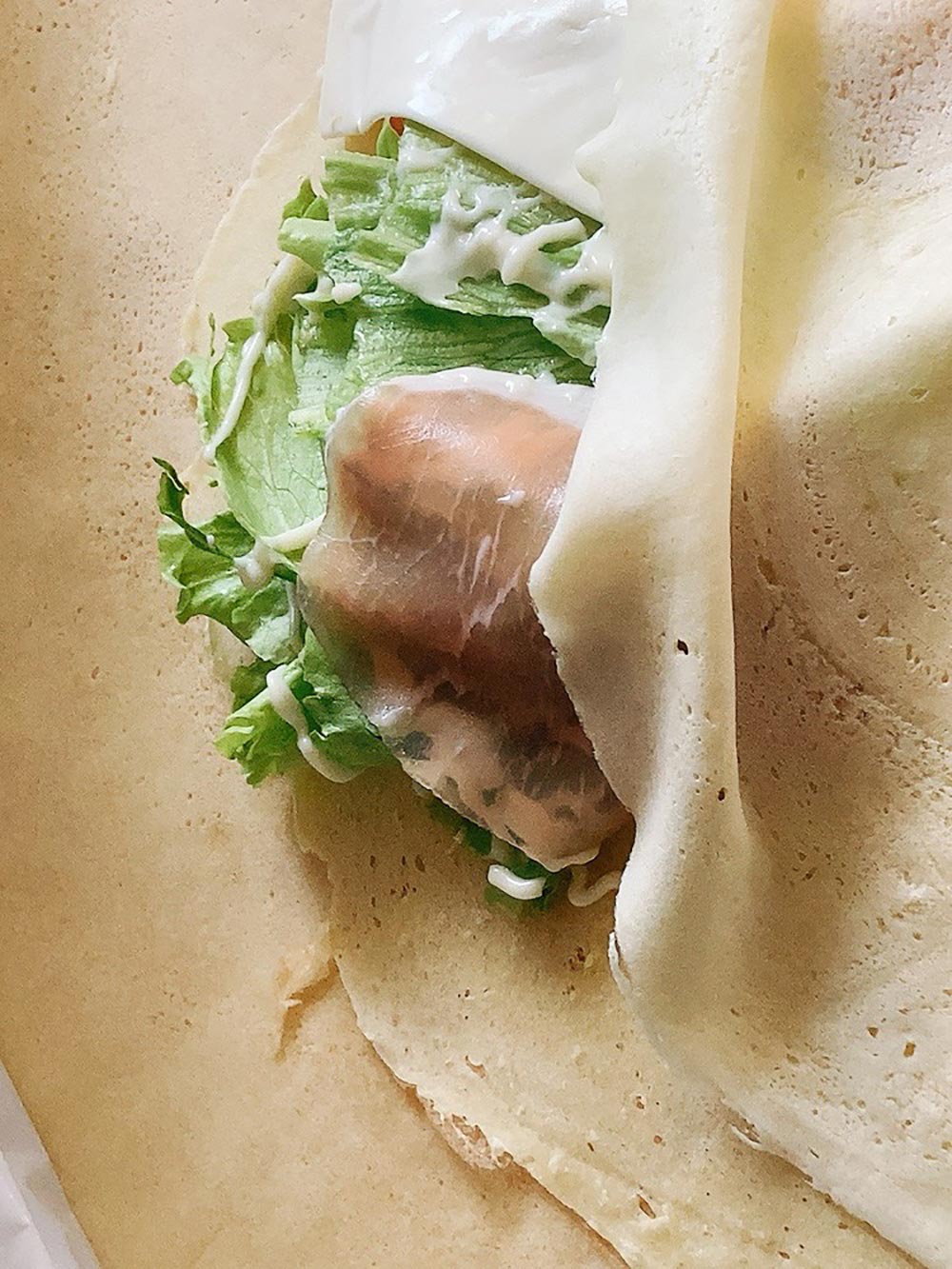 『ハムヤサイクレープ』 当日販売価格(税込)750円 ビールのお供にもピッタリのミール系クレープです。 |