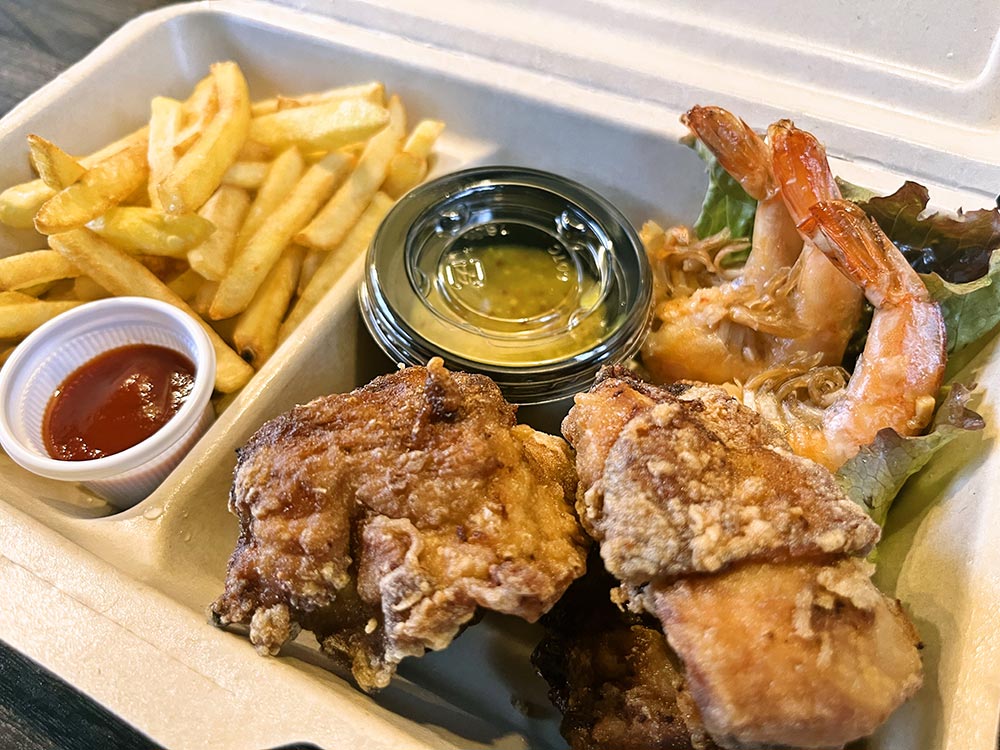 『おつまみプレート』 当日販売価格(税込)1,300円 フライドポテト・モチコチキン・ガーリックシュリンプの盛り合わせ |