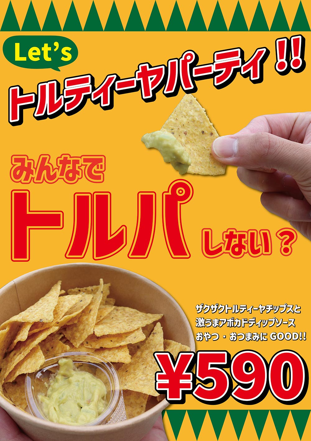 『トルティーヤパーティ』 当日販売価格(税込) 590円 パリパリ美味しいトルティーヤチップスをアボカドディップソースと一緒に! |