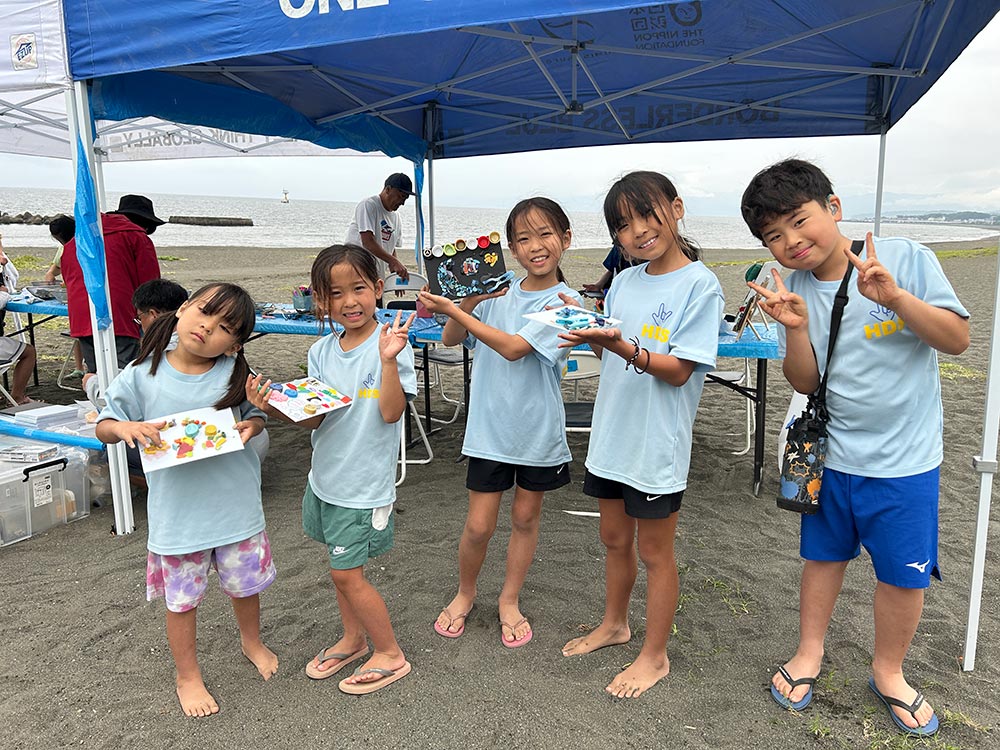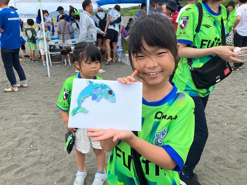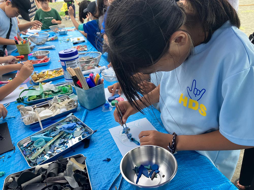 清掃活動の後には、子どもたちと一緒に回収したマイクロプラスチックを活用した「海ごみアート」制作も実施。