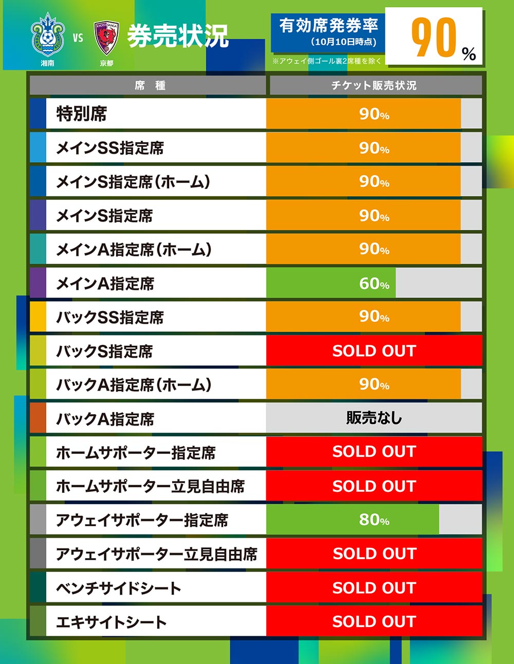 10月19日(日)京都サンガF.C.戦(15:00キックオフ/レモンガススタジアム平塚)のチケット券売状況をお知らせいたします。