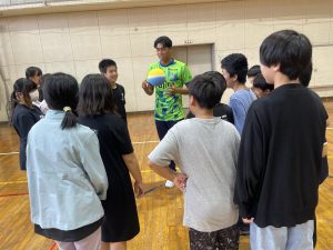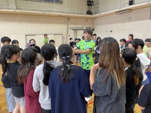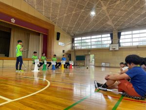 池田選手の進行のもと、まず初めにアイスブレイク!普段、選手が練習のウォーミングアップで行っている運動を行った後に4グループに分かれ、選手が各チームに入り、ボール送り競争!
