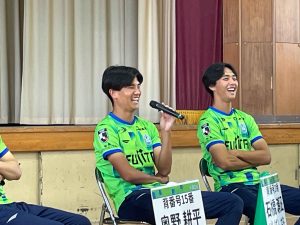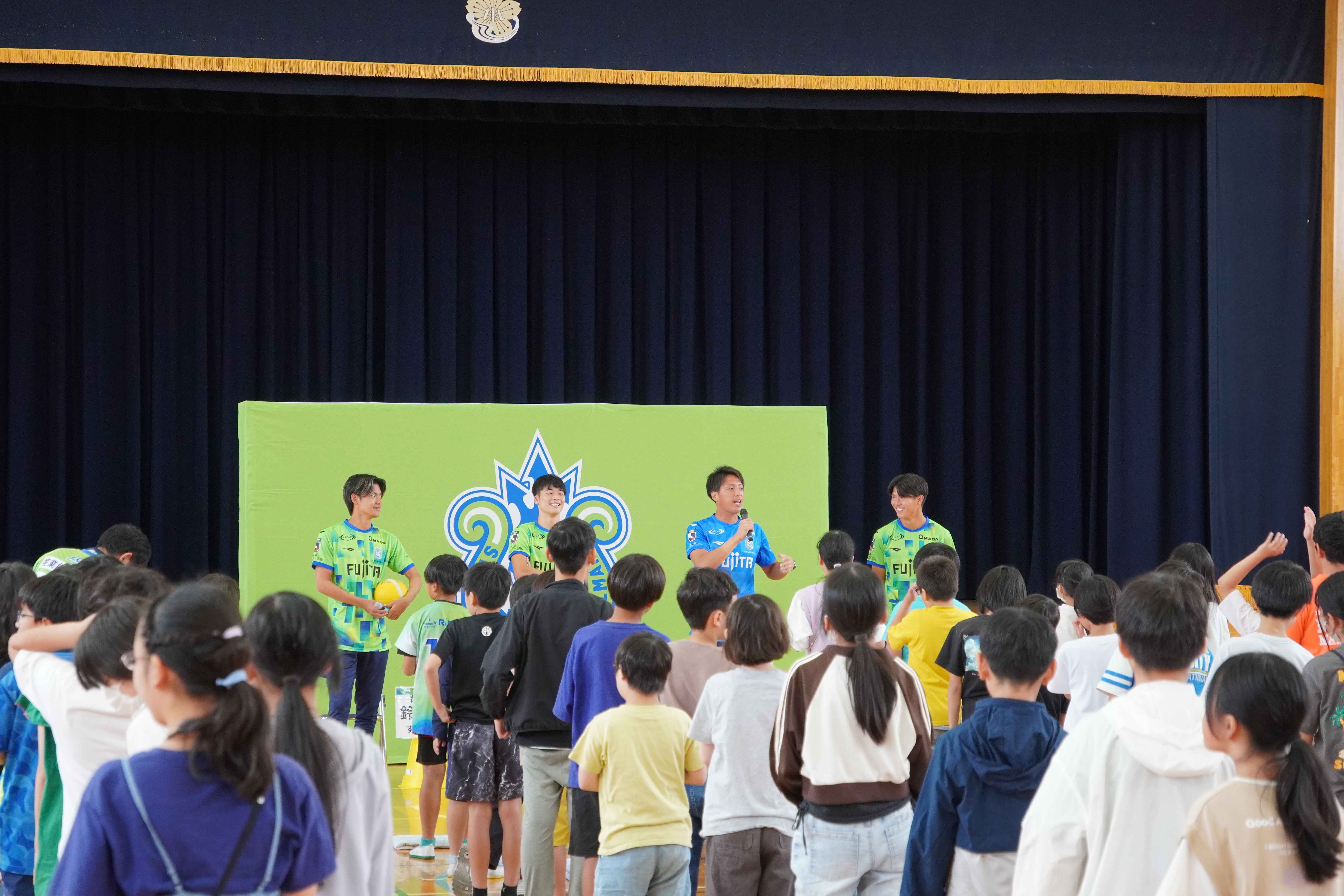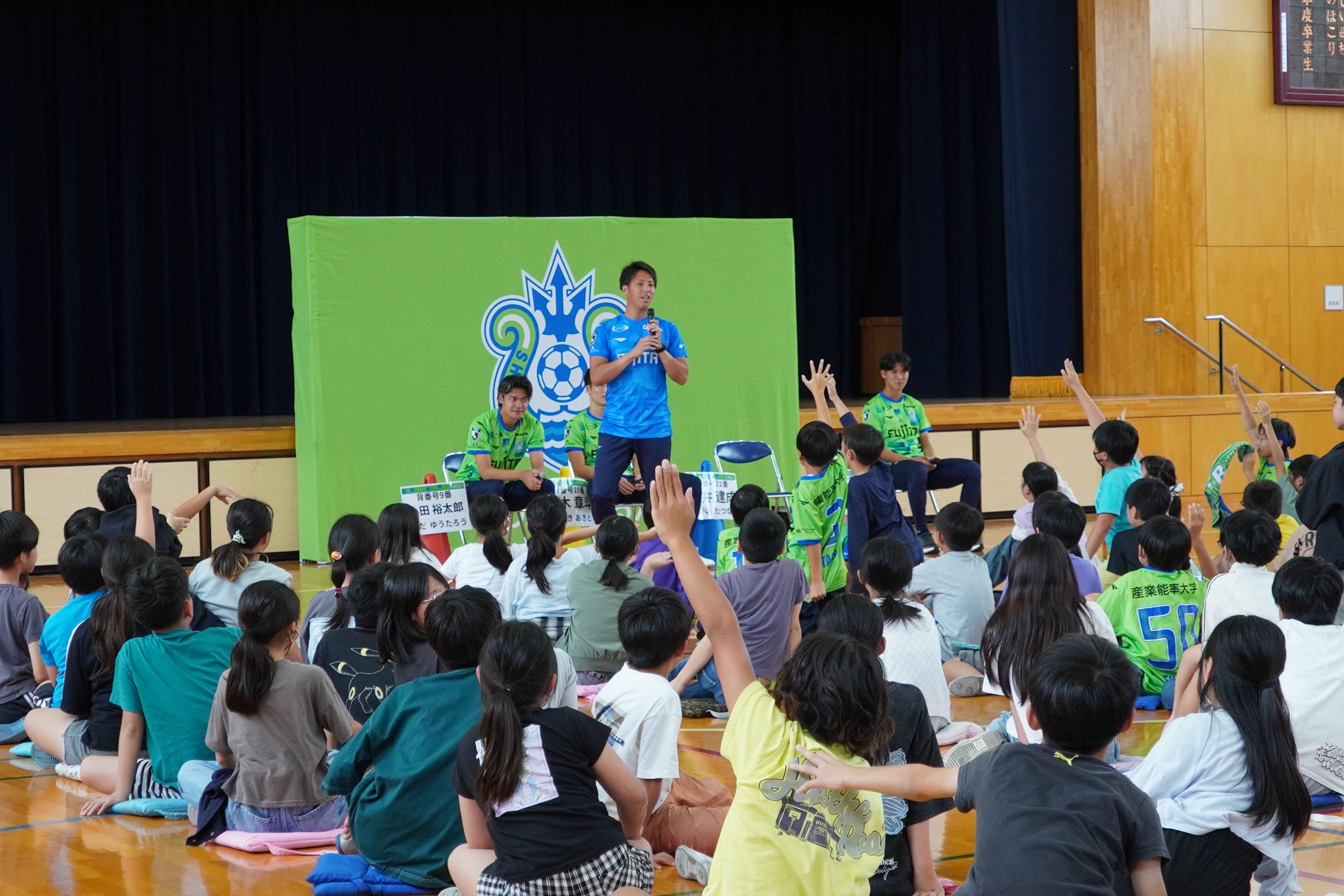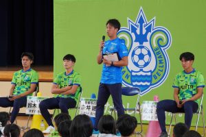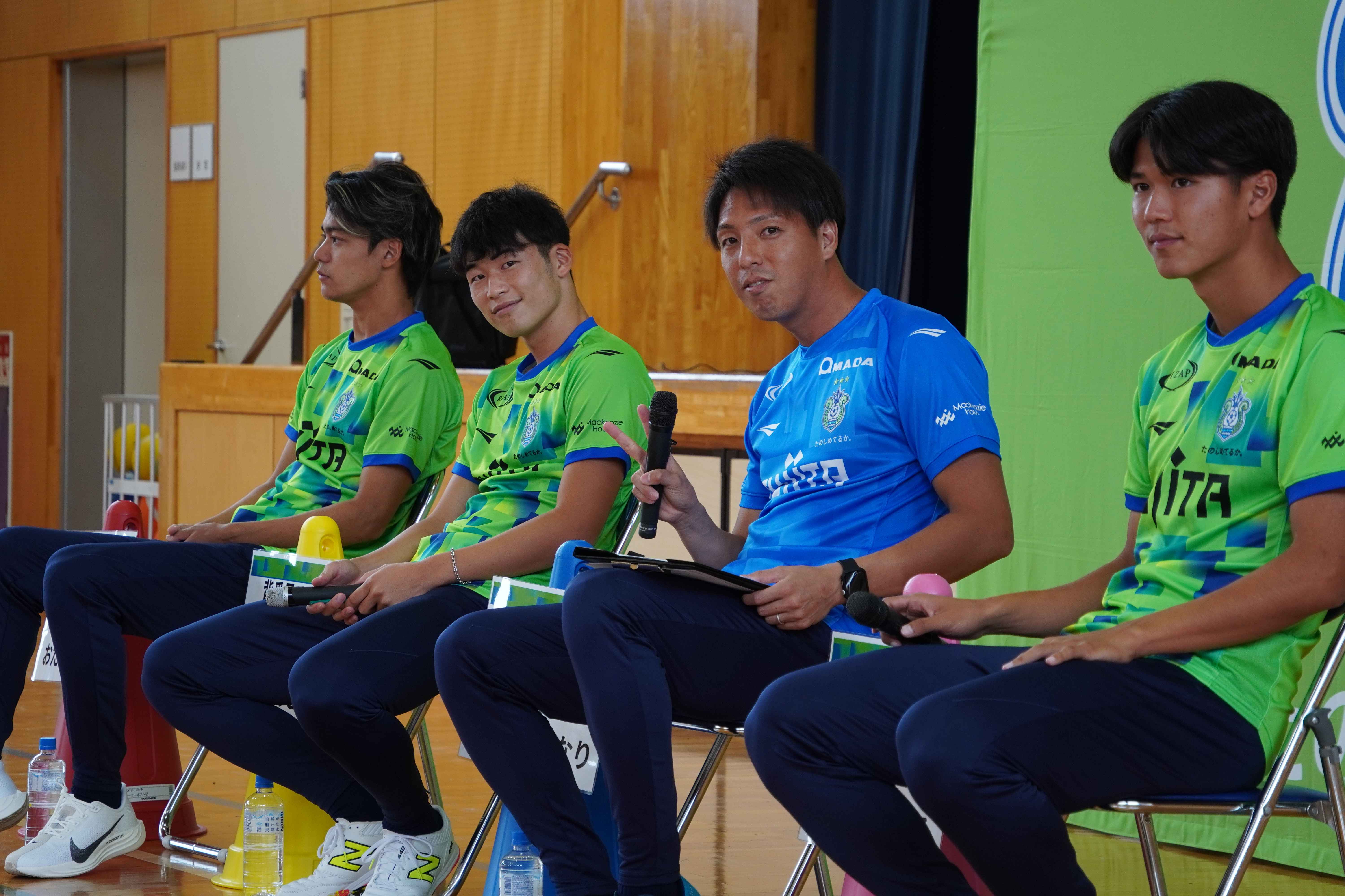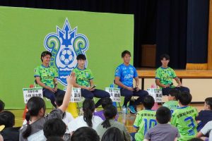 岡崎小学校に、池田昌生選手、大岩一貴選手、本多康太郎選手、髙橋直也選手が訪れ、選手それぞれが自分の経験をもとに「夢」や「サッカーへの想い」について語りました。
