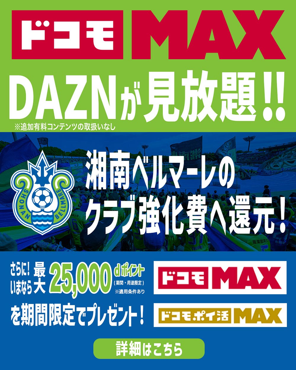 湘南ベルマーレは、株式会社NTTドコモが提供する料金プラン「ドコモ ポイ活 MAX」「ドコモ MAX」と連携し、サポーターの皆さまの応援がクラブの強化費に繋がる「推しJクラブ応援キャンペーン」を開始いたします。