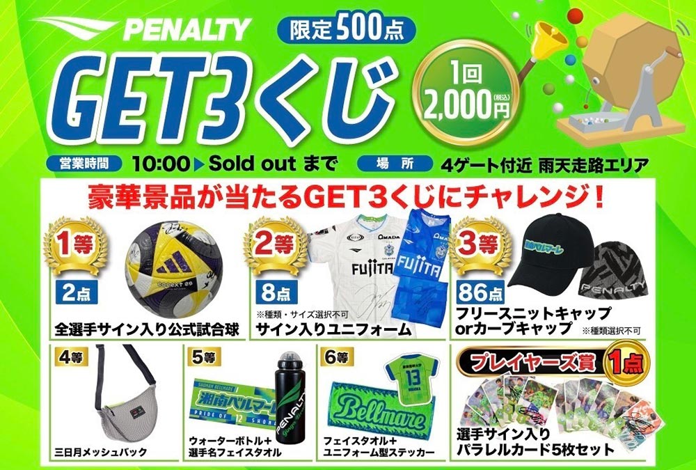 さらに「PENALTY GET3 SALE」に合わせて、選手直筆サイン入りユニフォームや公式試合球など、豪華景品が当たる「GET3くじ」も販売!