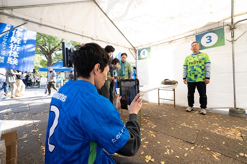 スマートフォンやタブレットで撮影した姿勢や動作をAIが解析し、最適なトレーニングメニューを提案する体験型ブース。大人から子どもまで多くの方にご参加いただきました。