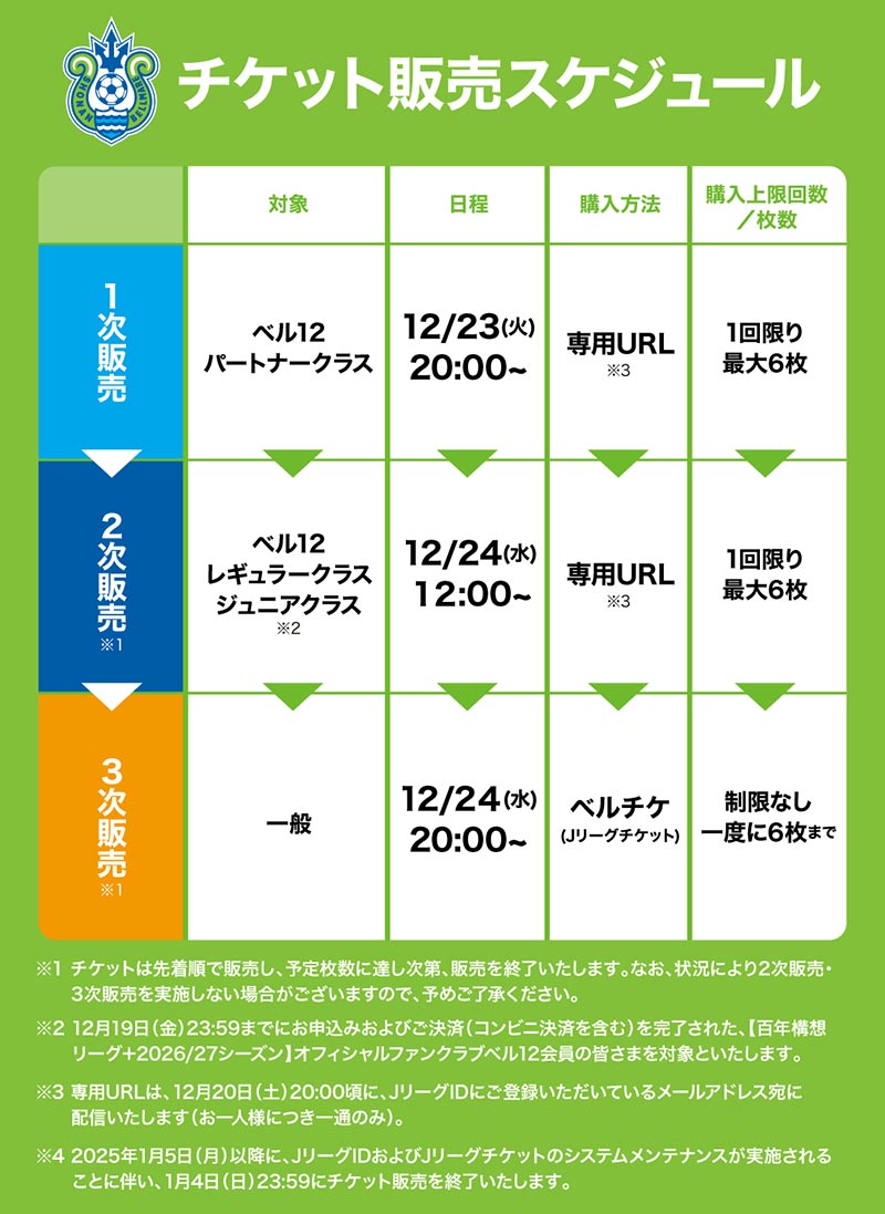 ※1次&2次販売は、12月19日(金)23:59までにお申込みおよび決済(コンビニ決済を含む)を完了された【百年構想リーグ+2026/27シーズン】オフィシャルファンクラブベル12会員の皆さまがご購入いただけます。
