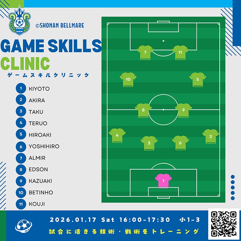 1月17日(土)に湘南ベルマーレアスレティックセンターフットサルコートで、小学1~3年生対象「ゲームスキルクリニック」を開催いたします。