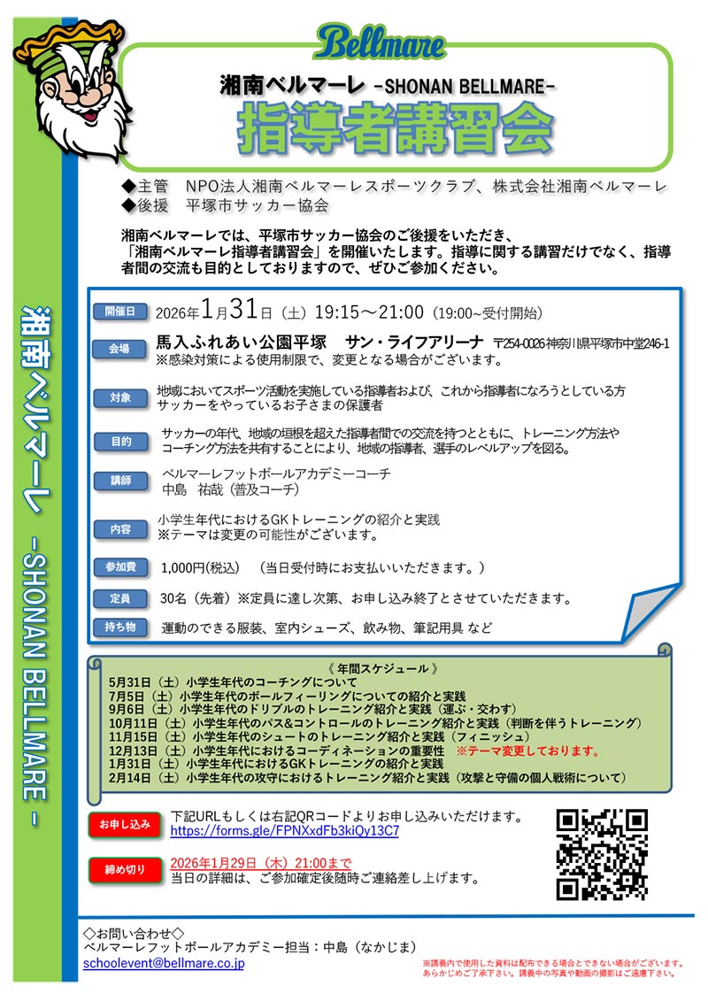 1月31日(土)に馬入ふれあい公園ひらつかサン・ライフアリーナで平塚市サッカー協会にご後援いただき「湘南ベルマーレ指導者講習会」を開催いたします。