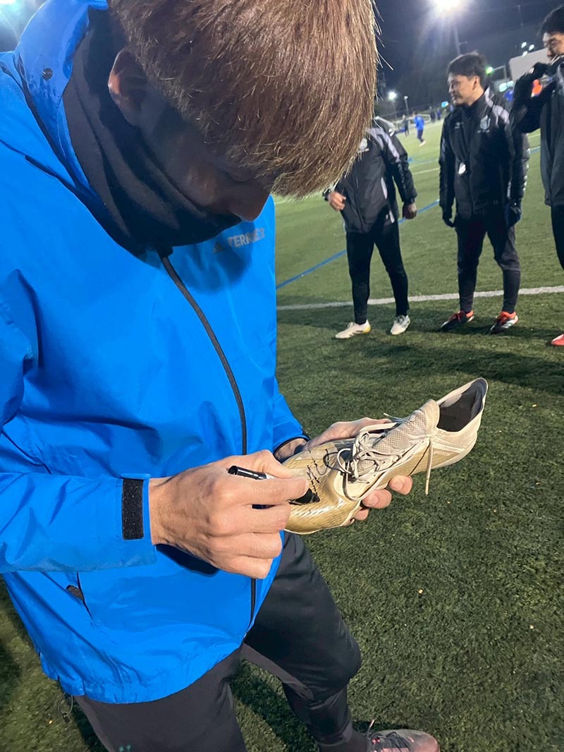 トレーニングに先立ち、平塚アカデミーダイレクターからのミーティングが行われ、「ホームタウン厚木市出身で、アカデミーから育った真田幸太選手です。アカデミー出身の先輩から直接教わるこの機会を、大きな成長の場にしてほしい」と選手たちへメッセージが送られました。