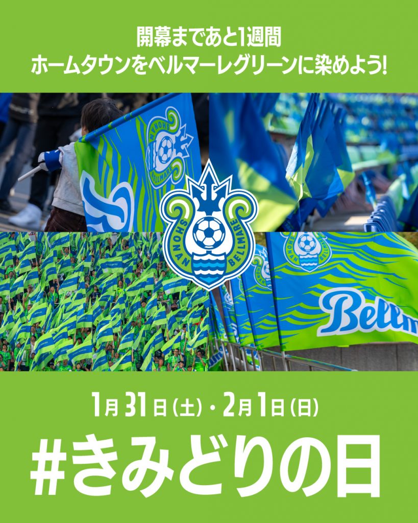 祝日に国旗を掲揚する方がいらっしゃるように、シーズン開幕を記念して開幕戦の前週を「きみどりの日」とし、ベルマーレグッズを掲揚して街をベルマーレグリーンに染めようという企画です。