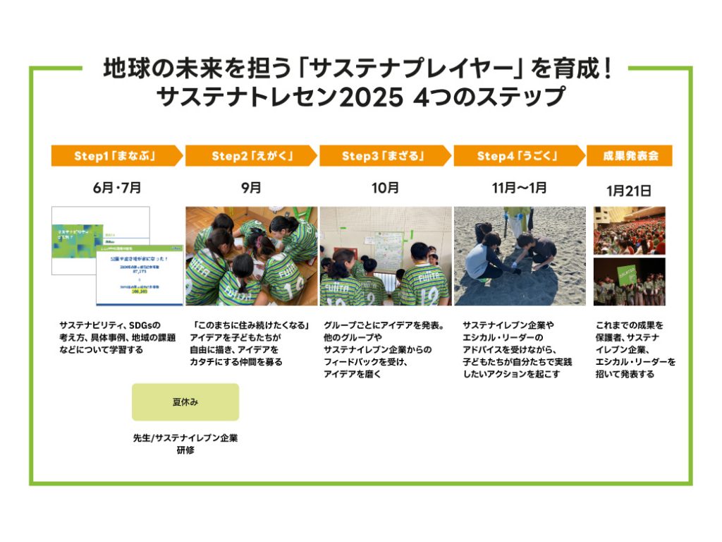 「世界はたのしく変えられる」を合言葉に、 地域の次世代のサステナビリティ人財を育成する新しい教育プログラムです。「夢づくり 人づくり」をミッションに掲げる湘南ベルマーレと、地域のSDGs/サステナビリティを推進する「サステナイレブン企業」*・行政が連携し、小学校の探究学習の授業の中で、地域の未来を担う「サステナプレイヤー」を育てていきます。