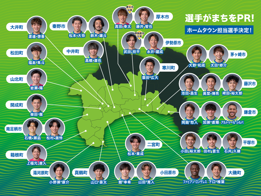 湘南ベルマーレでは、ホームタウン各市町の魅力発信や各市町の広報に協力させていただくことによってホームタウンをより盛り上げ、クラブや選手を身近に感じていただくきっかけとなることを目指し、各ホームタウンに担当選手を割り当てています。