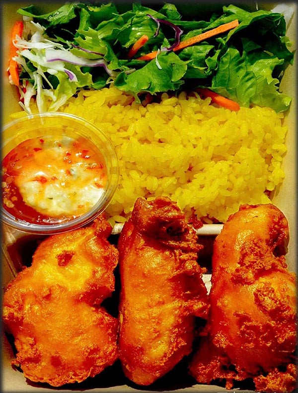 『モチコチキン ライス付き』 当日販売価格(税込): 950円 もち粉をまぶして揚げたハワイアン唐揚げ |
