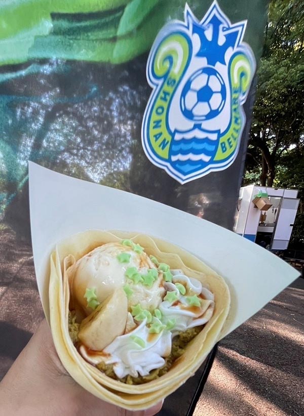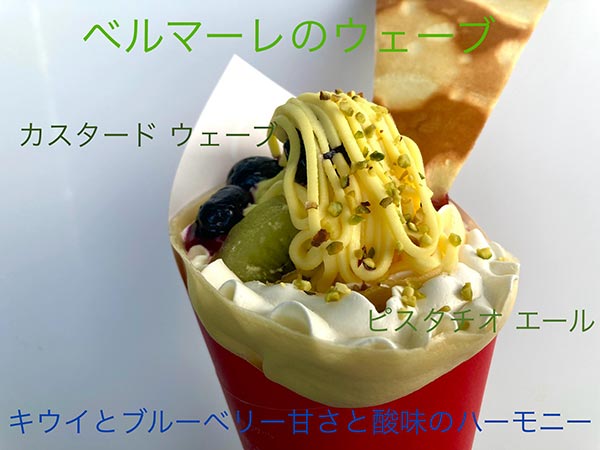 『ベルマーレのウェーブ』 当日販売価格(税込): 800円 キウイとブルーベリーのカスタード生クリーム。 スタジアムに響き渡る応援をイメージしたカスタードウェーブとピスタチオエール。みんなで踊ろう!ベルマーレ限定。 |
