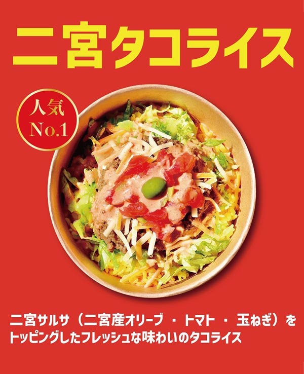『二宮タコライス』 当日販売価格(税込):1,180円 二宮サルサ(二宮産オリーブ・トマト・玉ねぎ)をトッピングしたフレッシュな味わいのタコライス。 |