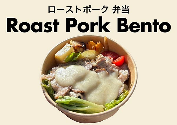 『ローストポーク弁当』 当日販売価格(税込):1,200円 豚肉と野菜をオリジナルスパイスでじっくり火入れをし、特製のグレイビーソースが波のようにお口の中で広がります!!ボリューム満点のお弁当です。 |