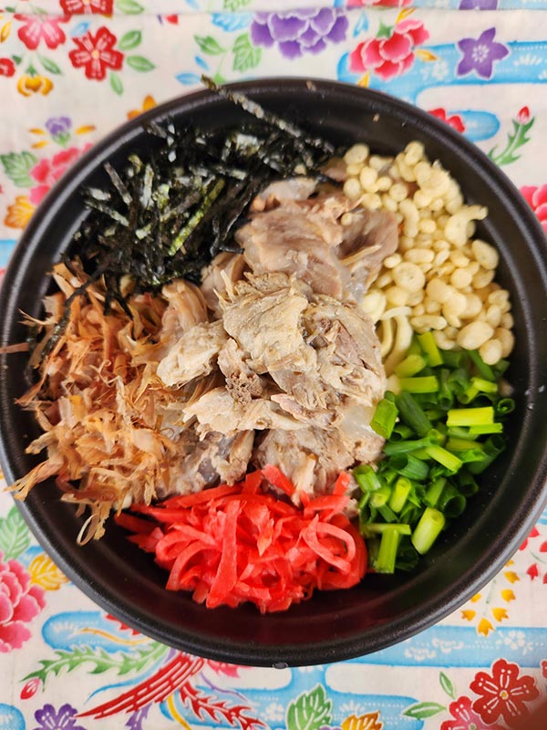 『沖縄まぜそば』 当日販売価格(税込): 900円 完全オリジナル商品でかつおだしベースの汁無し沖縄そばです! |