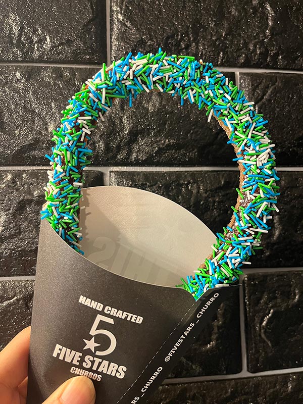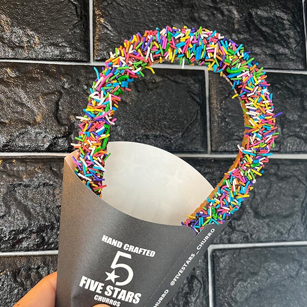 『レインボーシュガー』 当日販売価格(税込): 600円 当店を代表する人気No. 1の圧倒的に映えるチュロス! |