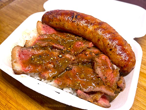 『ステーキ&フランク』 当日販売価格(税込):1,600円 チャンピオンBBQステーキとオリジナルBBQフランクのセット!ライスも追加できます。ステーキ倍盛りオプションで、お肉が倍の超ボリューム満点に! |