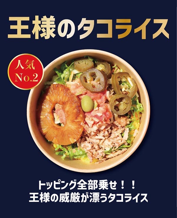 『王様のタコライス』 当日販売価格(税込):1,380円 トッピング全部乗せ!王様の威厳が漂うタコライス。 |