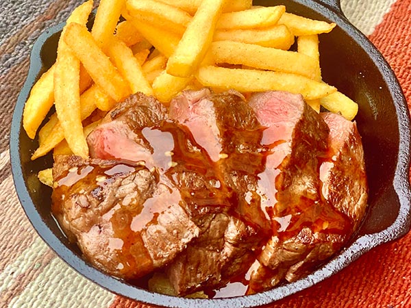 ステーキは赤身の塊肉を焼いて切分けオリジナル特製ソースをかけてフランクはリングイッサと呼ばれるとってもジューシーな物をご用意してお待ちしてます!