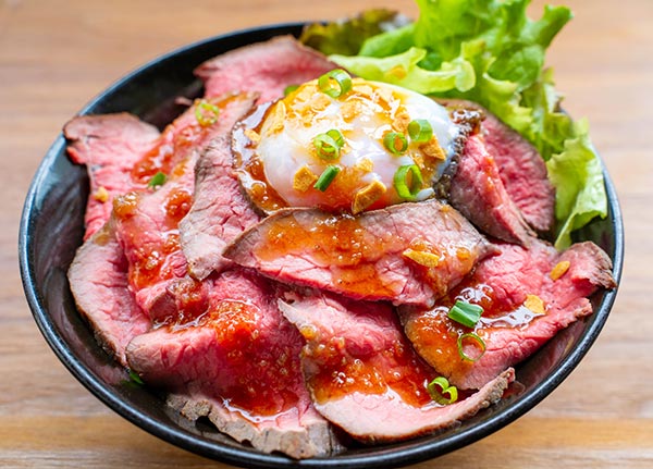 『湘南ローストビーフ丼~温玉&特製ソース~』 当日販売価格(税込):1,200円 当店のローストビーフは低温熟成調理をしているので柔らかくしっとりした仕上がりになってます。温玉と特製ソースが絡み合って絶妙なハーモニー! |